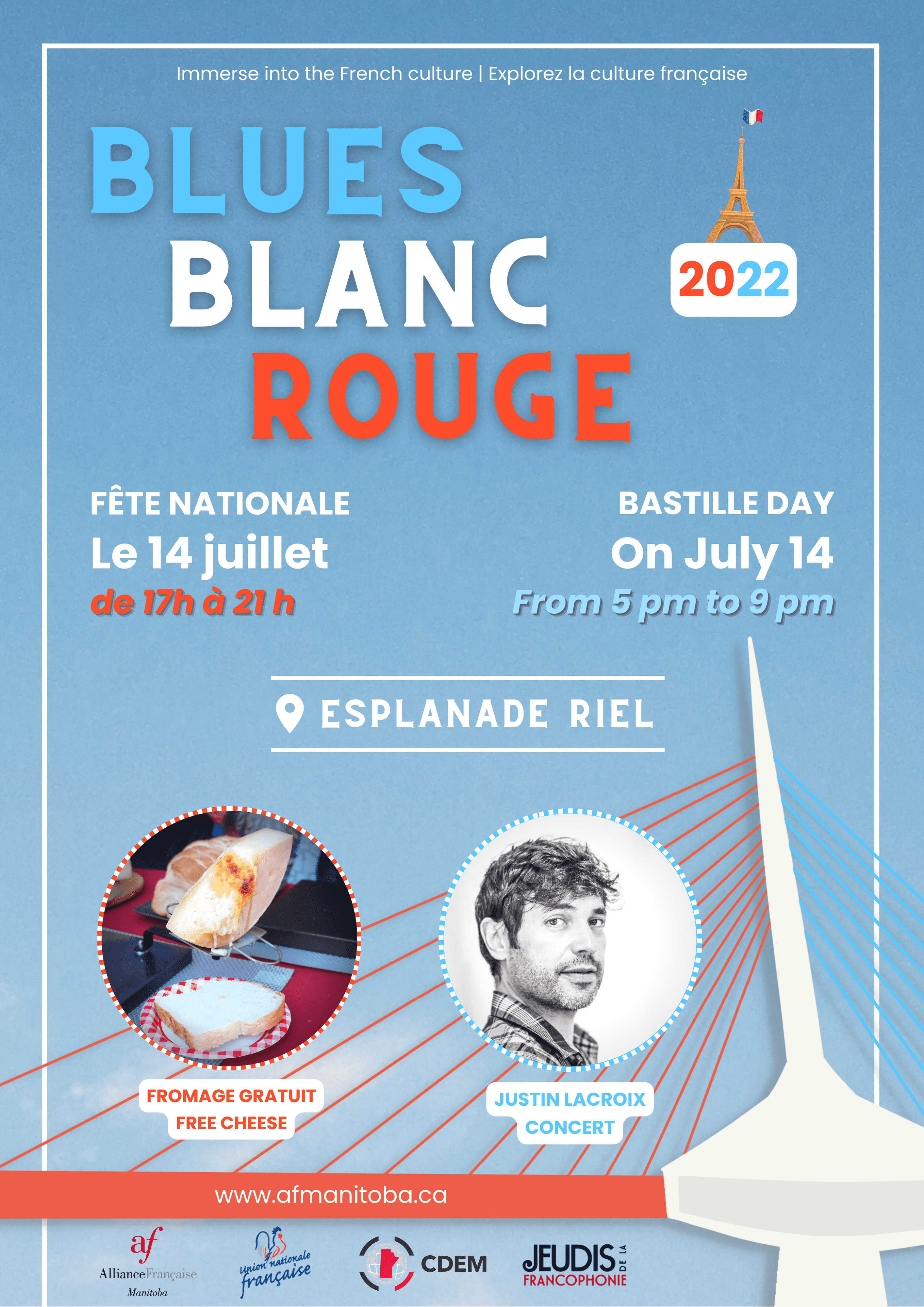 Blues, Blanc, Rouge is the name of our special event at the Alliance française of Manitoba for Bastille Day (July 14th), since 2016! This year, the open-air event will take place on the Esplanade Riel.