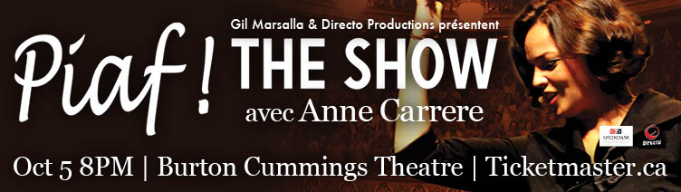 Piaf! Le spectacleOctober 5 | 8pm | Burton Cummings Theatre Redécouvrez la musique de cette légende de la chanson française dans Piaf! Le spectacle. Présenté dans plus de 30 pays et acclamé par la critique, ce spectacle conçu et mis en scène par Gil Marsalla met en scène Anne Carrere, qui interprète Édith Piaf avec brio. Discover and rediscover the songs of the legendary French singer Édith Piaf in Piaf! The Show. Having toured more than 30 countries to worldwide acclaim, this show – conceived and directed by Gil Marsalla – features French singer Anne Carrere, who interprets Édith Piaf with great talent. |