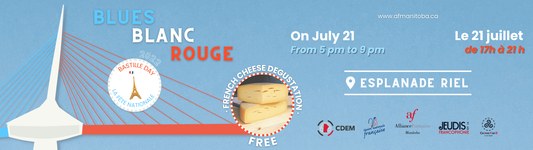 Blues, Blanc, Rouge is the name of our special event at the Alliance française of Manitoba for Bastille Day (July 14th), since 2016! This year, the open-air event will take place on the Esplanade Riel.