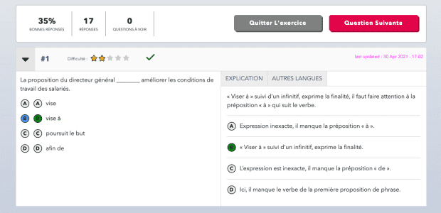 More than 1300 exercises for DELF B1 and 1700 exercises for DELF B2 included in our DELF training with detailed explanations in French.
