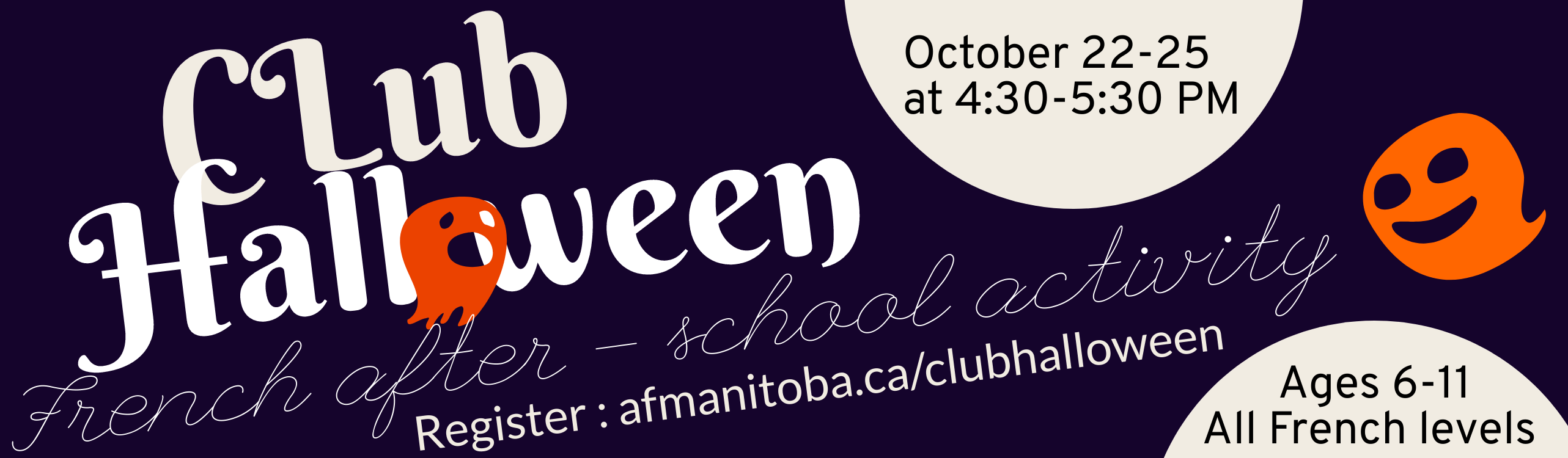 Alliance Française of Manitoba is planning a series of 60 min Halloween-themed arts and crafts after-school, en français, from October 22nd - 25th, from 4:30 PM to 5:30 PM! Participants will be familiarized with French terminology relating to Halloween, in a fun and dynamic setting.